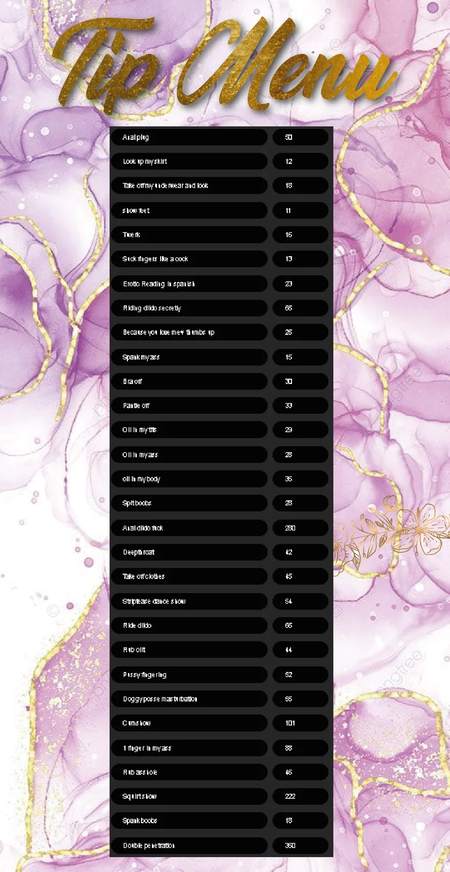 Στα Τέσσερα, Ahegao, Spanking, Ερωτικός χoρός, Δάχτυλο, Flashing, Γυμνόστηθα, Γιόγκα, rebotar, Camel Toe, Χύσιμο Μέσα, Δονητής, Βρωμόλογα, Στριπτίζ, Βαθύ λαρύγγι, Χορός twerk, Τακούνια, Σόου με λάδι, Gagging, Παιχνίδι Ρόλων, Ποδολαγνεία, bounce, Cowgirl, Χύσιμο, Άγριο, Οργασμός, Γαμήσι στα βυζιά, Αυνανισμός, Τσιμπούκι, Παιχνίδια του σεξ, Κάπνισμα, Πρωκτικό, Facesitting, Facial, Ταπείνωση, Πρωκτικά παιχνίδια